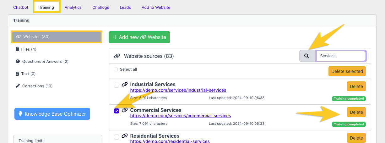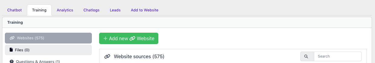 You can check or uncheck any items. Only checked links will be included for training. Click the button to “Start the Training” to index your selection. The form will disappear and you will see the list of website sources with their training progress/status.