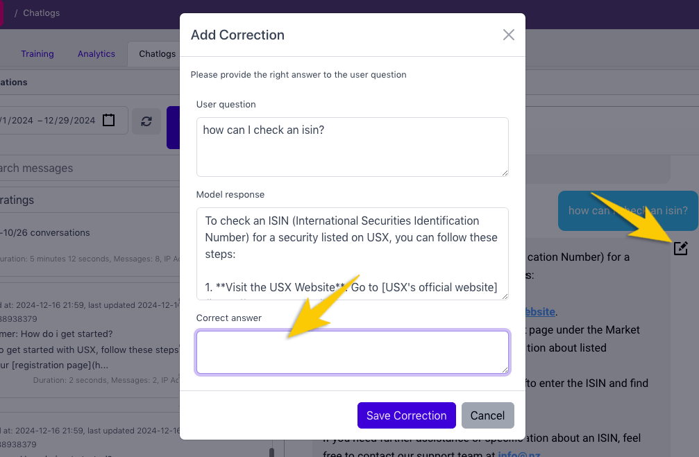 Tip: Copy/paste the Model response into the correction field to modify it.