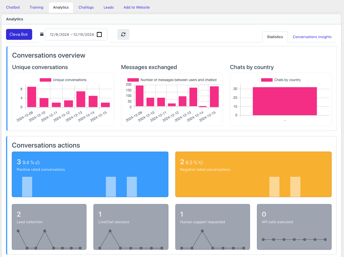 Chatlogs provide the full transcript history of conversations between your Cleva.Bot™ and your users. (If 'Live Chat' is enabled for your Cleva.Bot™ you will also find the conversation transcripts with your team members included here).
