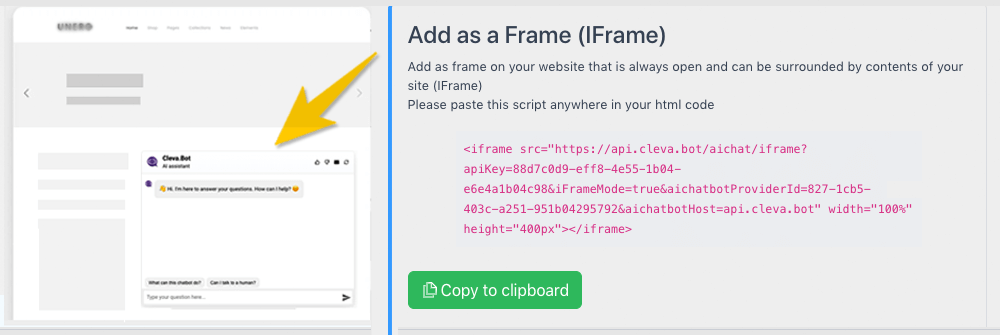 Use the iframe method if you want to display your Cleva.Bot™ as part of your webpage content.
